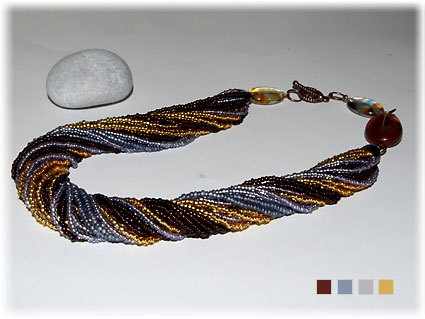 Коричневый, сиреневый, серый, золотой бисер (Чехия). Бусины коричневая, прозрачные (Чехия). Длина 45 см.